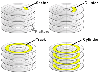 | 실린더 (Cylinder) | 여러 겹의 플래터 상에서 같은 트랙이 위치한 곳을 연결한 논리적 단위 |